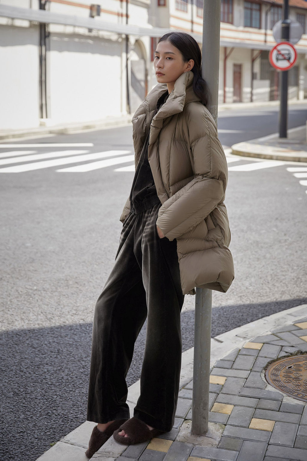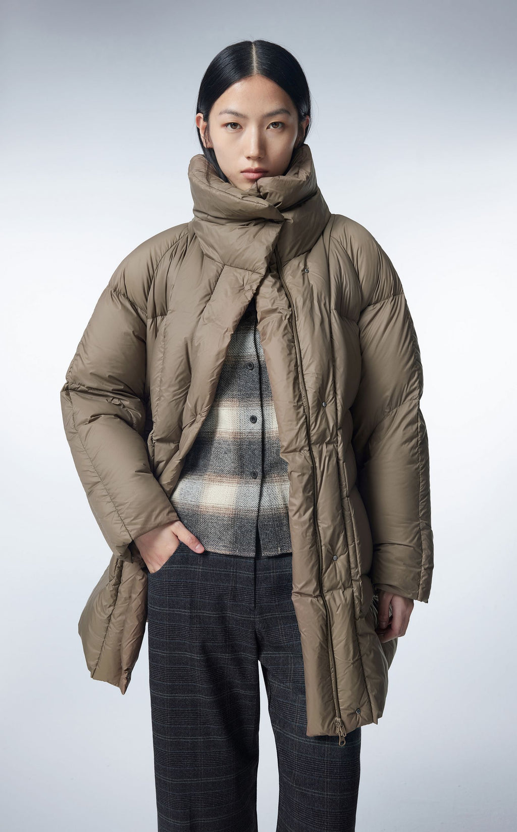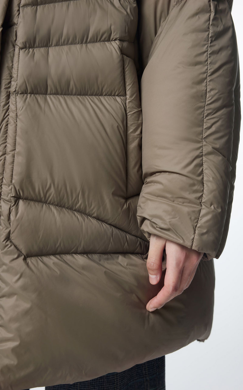 Ein warmer, schwarzer Daunenmantel mit hohem Stehkragen und einem verdeckten Zwei-Wege-Reißverschluss für optimalen Schutz vor Kälte. Die 5 schwarzen Druckknöpfe sorgen für einen zusätzlichen Verschluss und die beiden Seitentaschen bieten Platz für wichtige Gegenstände. Perfekt für kalte Tage und eine stilvolle Ergänzung für jede Garderobe.