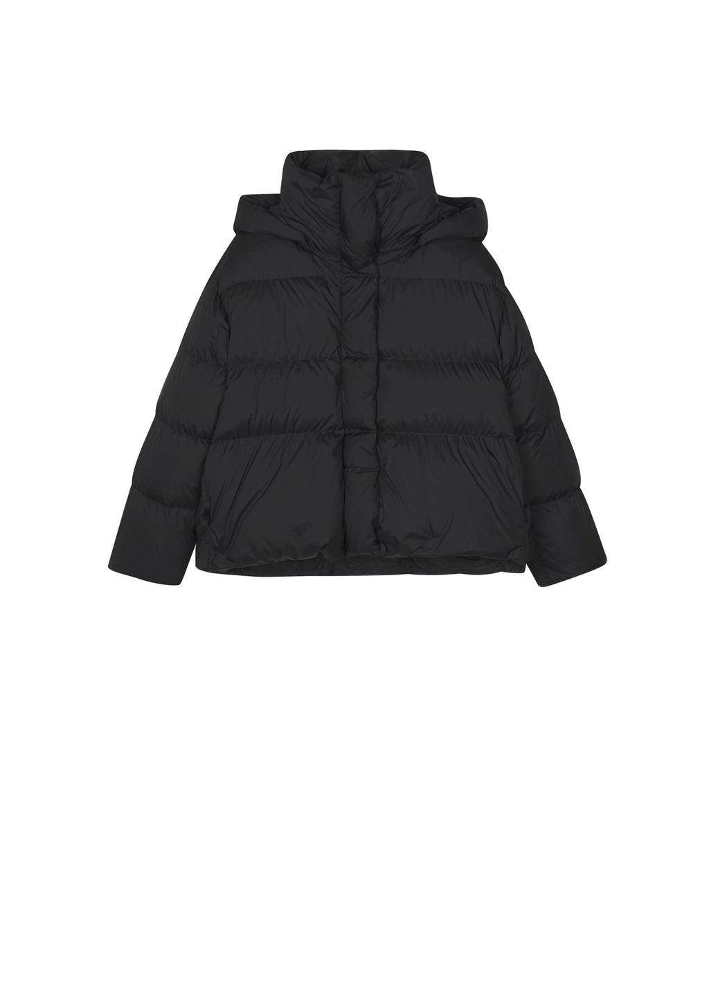 • Design: Modische, leicht verkürzte Silhouette mit großer eleganter Steppung, hohem Stehkragen und einer trendigen, unterschiedlichen Länge vorne und hinten.