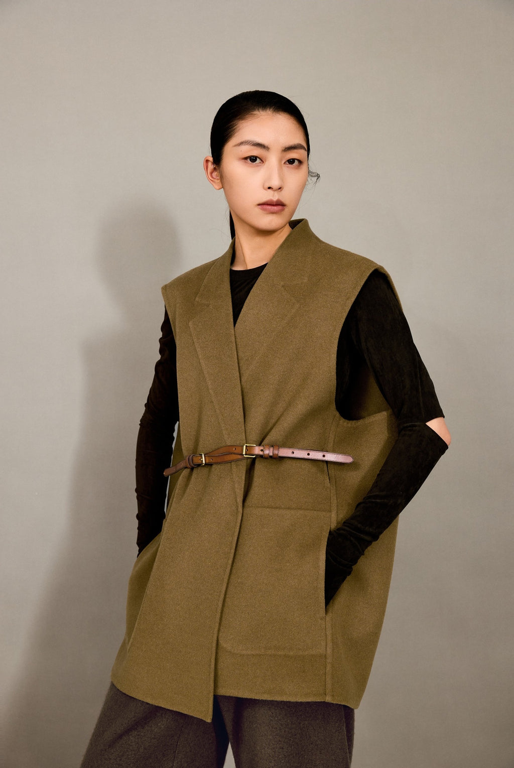 Diese Wollweste vereint zeitlosen Stil mit hohem Tragekomfort. Der angetäuschte Reverskragen und das Bindeband verleihen ihr eine elegante Note, während die hochwertige Wollmischung für wohlige Wärme sorgt. Ideal als stilvoller Begleiter über Blusen, Pullovern oder Kleidern.