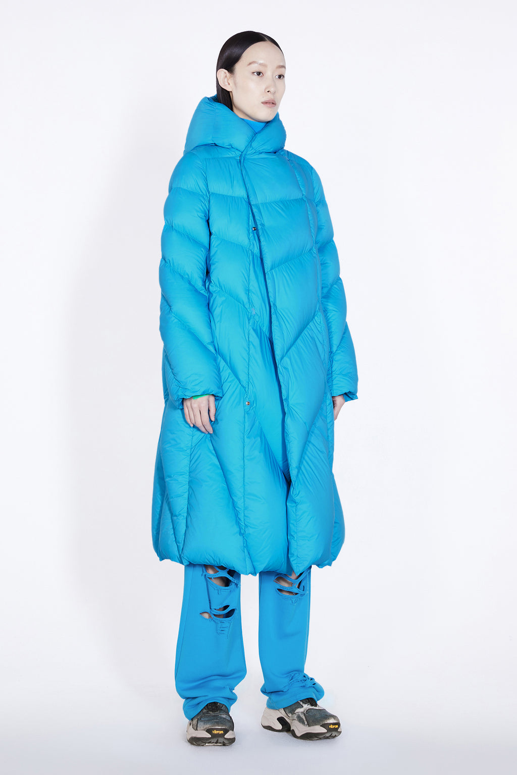 Design: Moderner, langer Daunenmantel in entspanntem Fit mit markanter, asymmetrischer Steppung – avantgardistisch und urban zugleich.